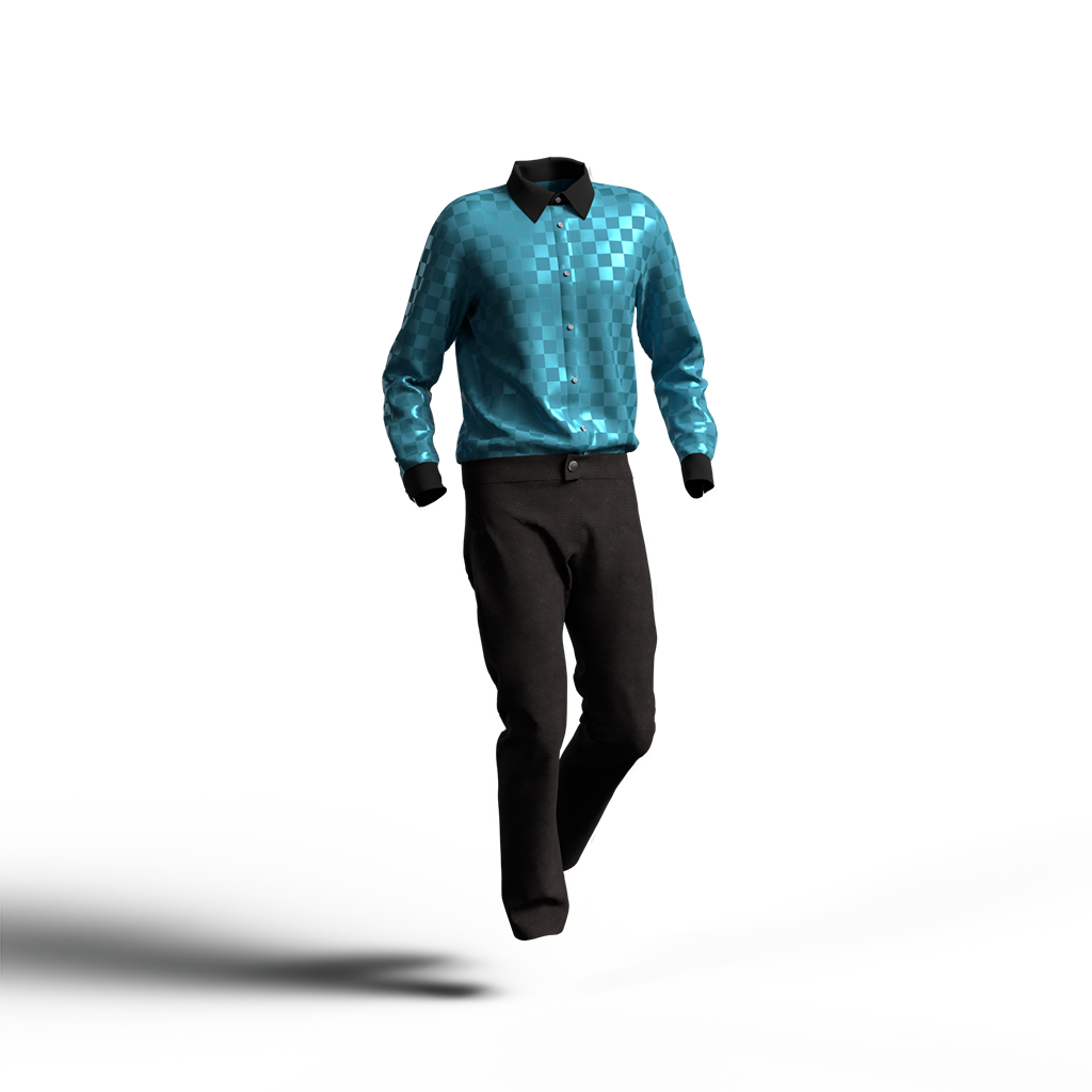 ブルーグリーンの市松模様シャツにブラックデザインパンツのコーディネート