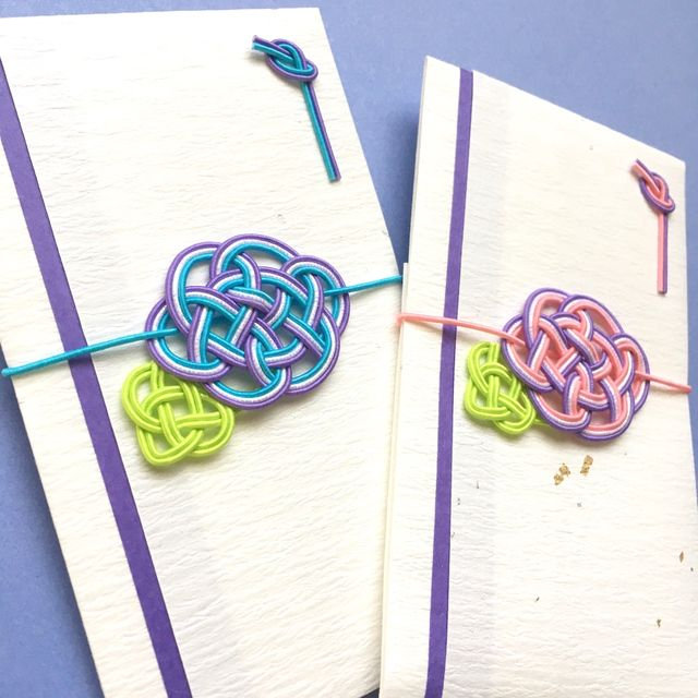 日本の伝統工芸である水引きをいろいろな結び方で成形して、ご祝儀袋やポチ袋に添えたりアクセサリー・小物の作品として仕上げられています。