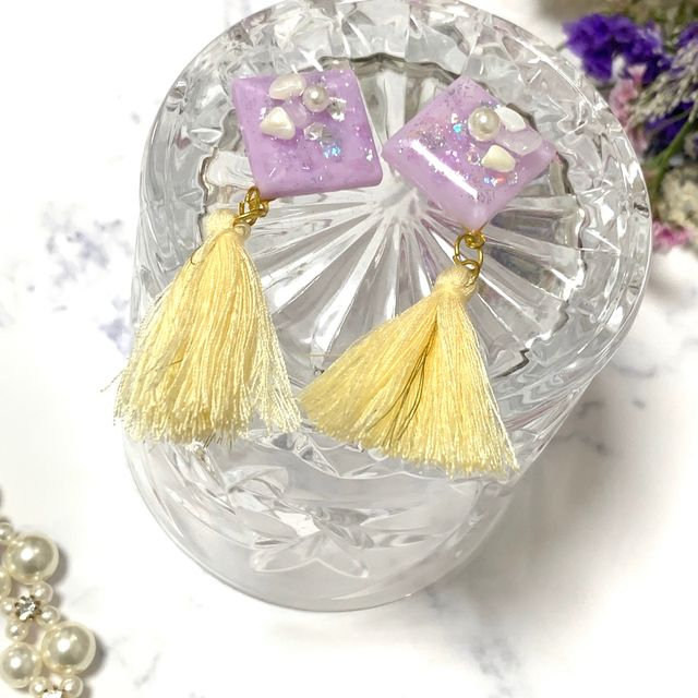 現在minne上では色違いで淡いラベンダーカラーも販売されています。藤色の優しい上品なカラーに、輝くような黄色のタッセルが合わせられていいます。大らかで高貴な雰囲気が伝わってきて、その日のおしゃれ気分をぐっと上げてくれますね♪ 素敵なカラーデザインです。