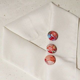 次にご紹介するのは半衿の生地デザインではなく、デコレーションとしてくるみボタンが取り付けられた作品です。こちらは三色団子を模した和風の愛らしいボタンです。くるみボタンが取付らた作品の多くはスナップでつけられるようになっていますので、バリエーションを楽しむことができますよ♪