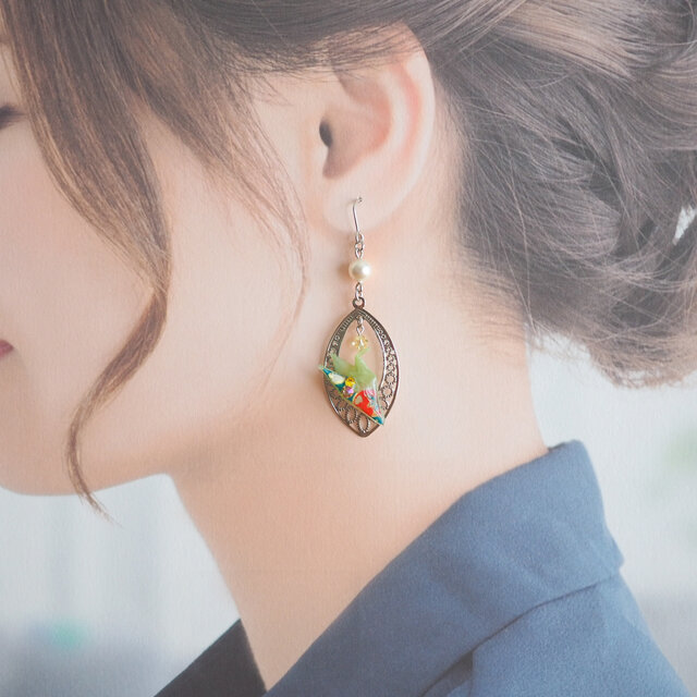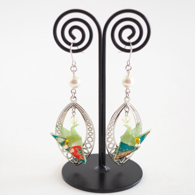 今回ご紹介するハンドメイド作品は「和の煌めき」シリーズで、羽ばたく鶴たちにリングをアソートしたきらきらと可愛い耳飾りです♪友禅和紙を使用し、ラインストーンをあしらっています。3色展開でそれぞれ異なる表情が楽しめますよ。