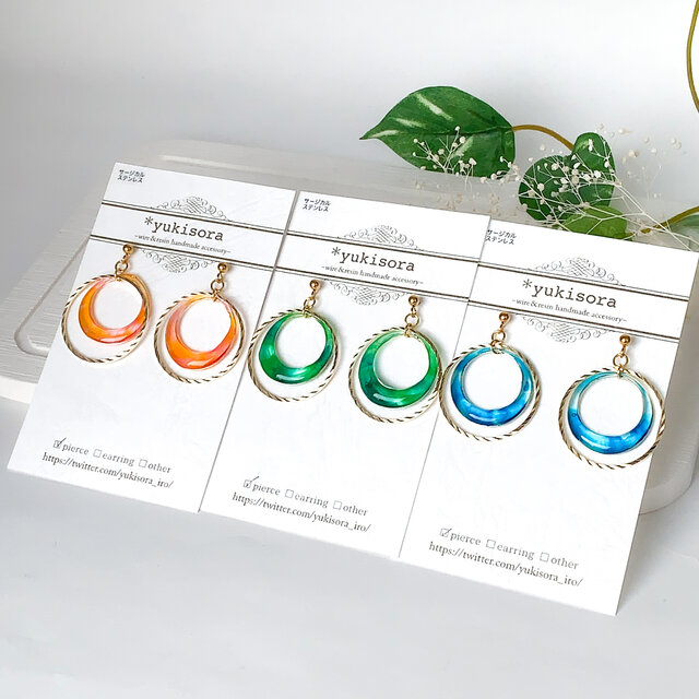 海をイメージしたクール×クリアな配色の耳飾りです。これからの季節にぴったりの爽やかな雰囲気ですね。