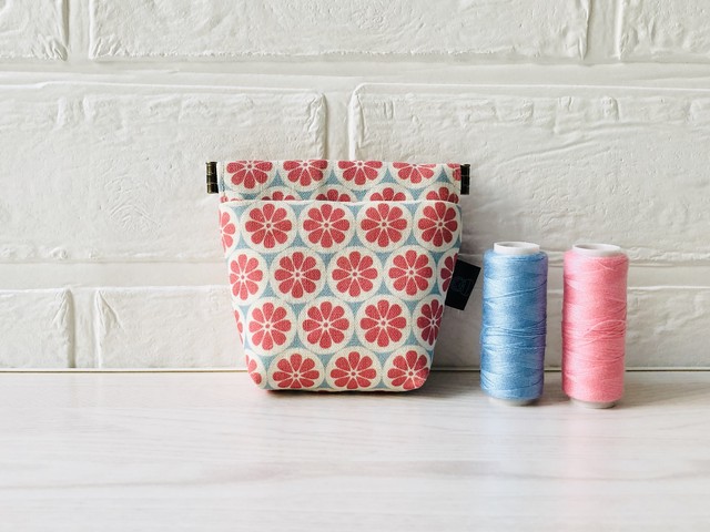 レトロな花柄のミニキャラメルポーチです。 おはじきみたいな柄がどこかなつかしい。 あめちゃんや・・・