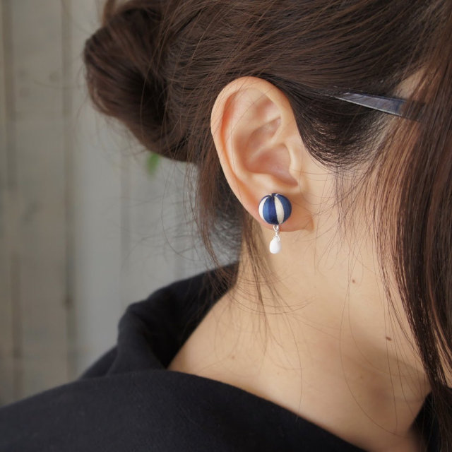 もこさんの巻き玉は、耳につけるタイプ(耳から垂らさないタイプ)の場合、くるみボタンを耳につけるように、巻き玉の側面を耳につける構造になっています。